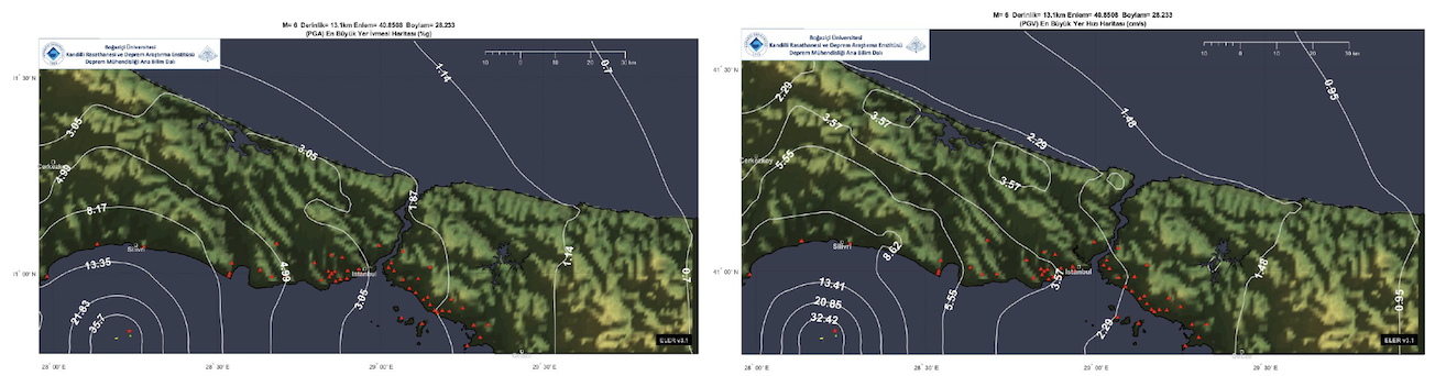 Figure 15. Distribution of peak ground acceleration, PGA, and peak ground velocity, PGV, levels per the Istanbul Earthquake Rapid Response and Early Warning System, IERREWS. Credit: Erdik et al., 2025, CC BY-NC-ND 4.0